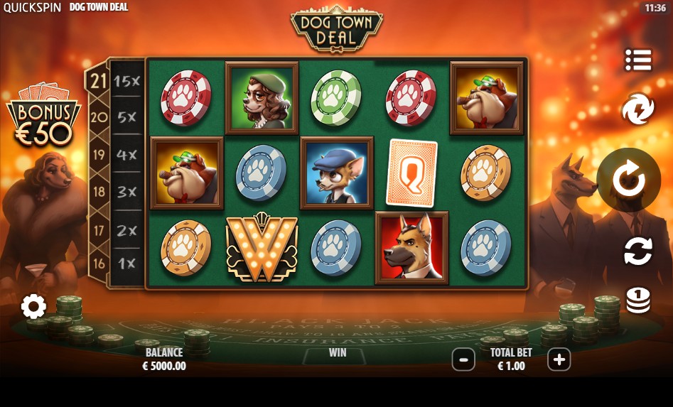 Dog Town Deal is a classic online slot game with simple rules and mechanics. The game features standard slot symbols such as playing card icons, bones, and dog houses. To win, players must match symbols across the paylines starting from the leftmost reel. Wild symbols can substitute for other symbols to create winning combinations, while scatter symbols can trigger bonus features.